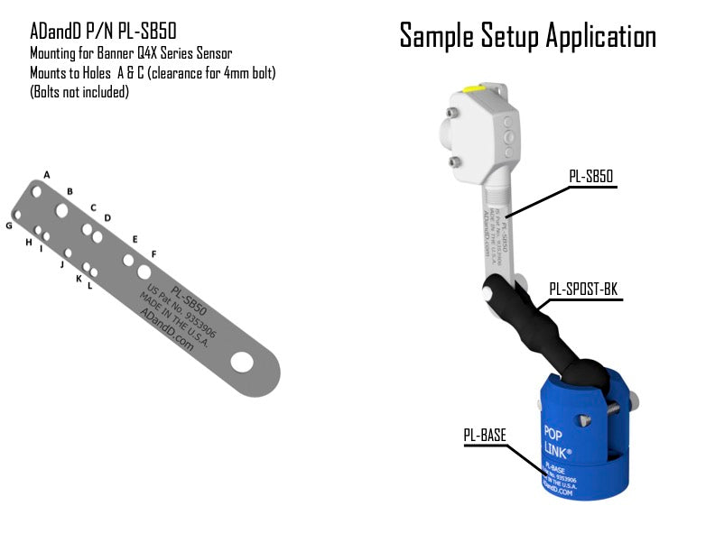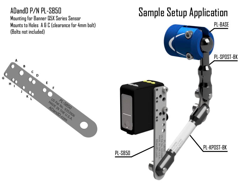 Banner Q5X Series Sensor mounts to PL-SB50 Holes A & C (clearance for 4mm bolt)