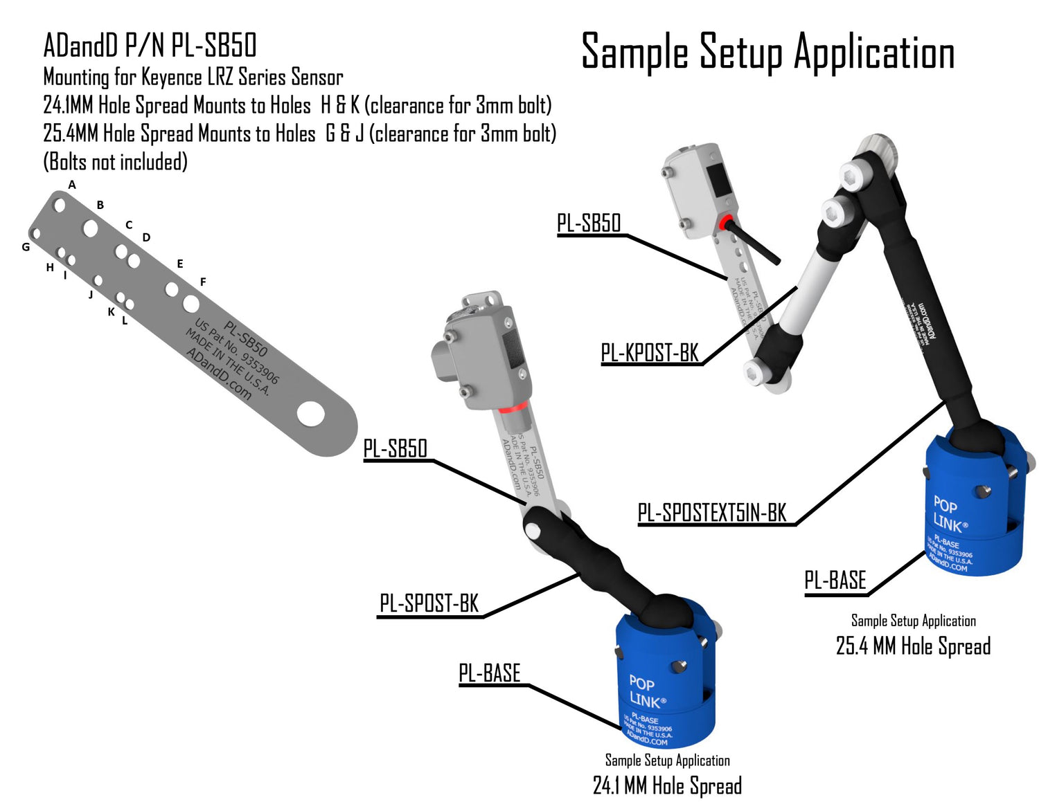 Mounts to PL-SB50 Holes G & J or H & K (clearance for 3mm bolt)