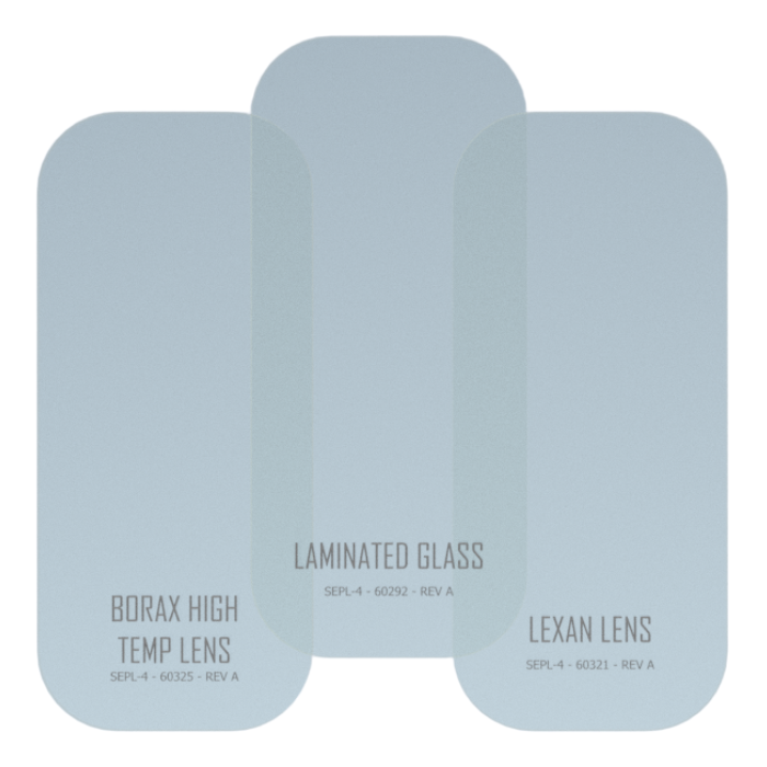 Lens options include: Laminated Safety Lens, Borax High Temperature Lens, and Lexan Polycarbonate High Impact Lens.